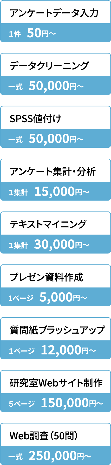 データベース設計、データ入力・クリーニング、SPSSのラベル付け・整形といった煩雑な作業を代行。Webからの情報収集も対応。